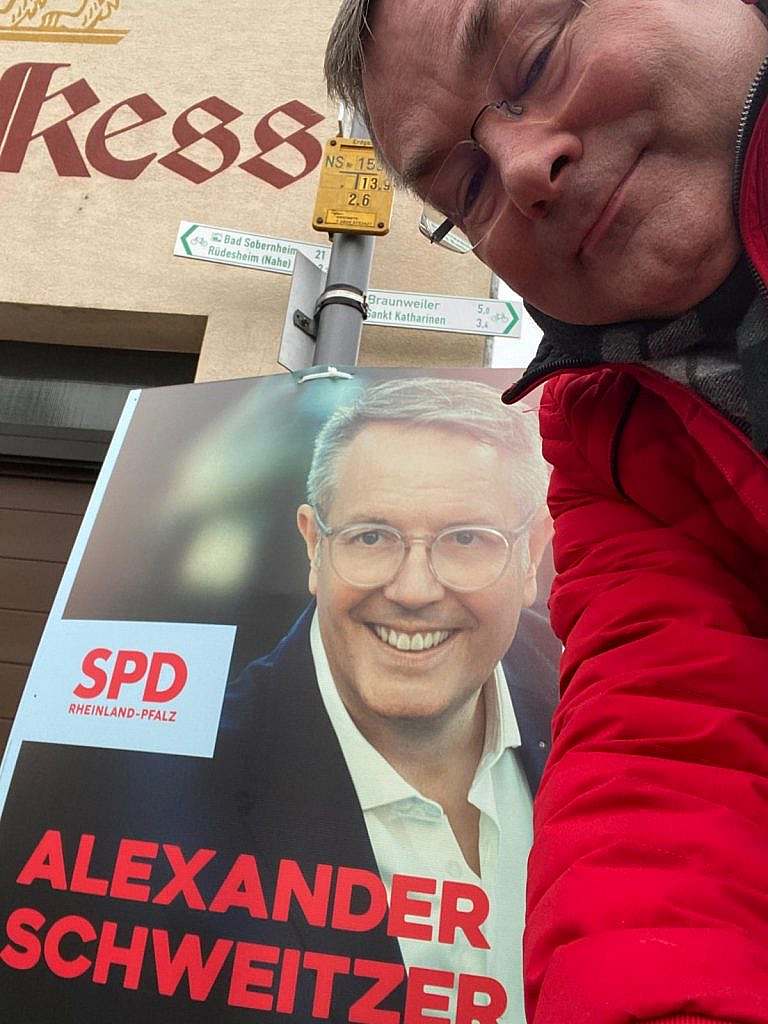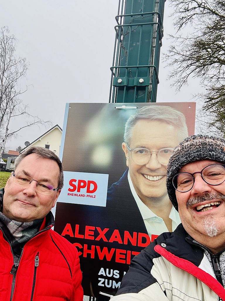 Aktuell, Allgemein, Ortsverein, Wahlen Landtagswahl 2026 : Plakatierung in der Fastnachtszeit läuft :-) 8. Februar 2026 Sonntag morgen, Nebelzeit, fast kein Auto weit und breit, ideal um durch das Land zu reisen um alle darauf hinzuweisen die Landtagswahl steht vor der Tür Aus diesem Grunde hängen wir, bildlich gesprochen mit unser Hand, den besten Mann für unser Land, den Alex Schweitzer , den MP, an vielen Stellen in die Höh, und freue uns wenn bei der Wahl die Mensche in sehr großer Zahl Alex und der SPD die Treue halte, das wär schee. Für gude Politik im Land besonders für Zusammenhalt März, merkts euch genau Mir grüße euch herzlichst, mit Hellau ! Sende Artikel als PDF Älter Neujahrstreffen 2026 Das könnte dich auch interessieren Impressionen unserer Gesprächsangebote 25. Mai 2024 Finanzielle Förderung wichtiger Einrichtungen: Frauenhaus und Cafe Bunt in Bad Kreuznach 28. Oktober 2020 Der VfL 1976 Roxheim e.V. hat ihn gefunden – den neuen 1. Vorsitzenden 14. Oktober 2021 Eine Antwort schreiben Antwort abbrechenDu musst angemeldet sein, um einen Kommentar abzugeben.